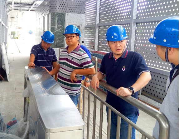 雄楚大街BRT示范站―理工大南站:公司領導詳細查看了現場施工情況,并囑咐施工人員,防汛期間一定要做好已安裝設備的保護工作,確保完成集團下達的通車任務。