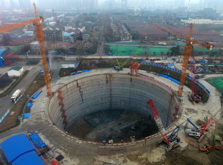 楊泗港長江大橋是省市重點項目。大橋主跨1700米,是武漢市第十座長江大橋、長江上首座雙層公路橋、世界上跨度最大的雙層懸索橋。南北兩岸設置南北錨碇,錨碇為重力式錨碇,采用外徑98米,墻厚1.5米的圓形地連墻加環(huán)形鋼筋混凝土內(nèi)襯結(jié)構(gòu)。錨碇基礎由地連墻、帽梁、內(nèi)襯、底板及填芯混凝土組成。錨碇基礎頂高程為24米(帽梁頂標高),基礎底面高程為-15米,最大開挖深度36米,開挖總量在26.2萬方左右。內(nèi)襯為沿豎向分段變厚的鋼筋混凝土環(huán)形結(jié)構(gòu),共12層,每層分為10個單元采用逆作法施工,即開挖一層土體施工一層內(nèi)襯,內(nèi)襯混凝土總方量在2.8萬方。