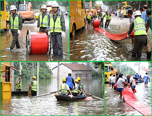 “龍吸水”慢慢往水里倒車,隊員們有的開始卸下笨重的接頭、寬厚的水帶;有的開始操作設(shè)備,有的乘小木劃子往深水區(qū)安放排水管。經(jīng)過大家在一個小時的緊張忙碌,設(shè)備全部安裝完成試車后,于14時開始抽排漬水。14時30多,兩個小分隊的隊員才開始分批吃午飯。